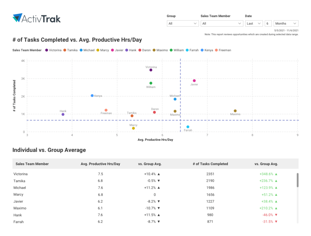 With this dashboard, you can compare the performance of sales team members by correlating the number of tasks completed per day versus the average productive hours per day.