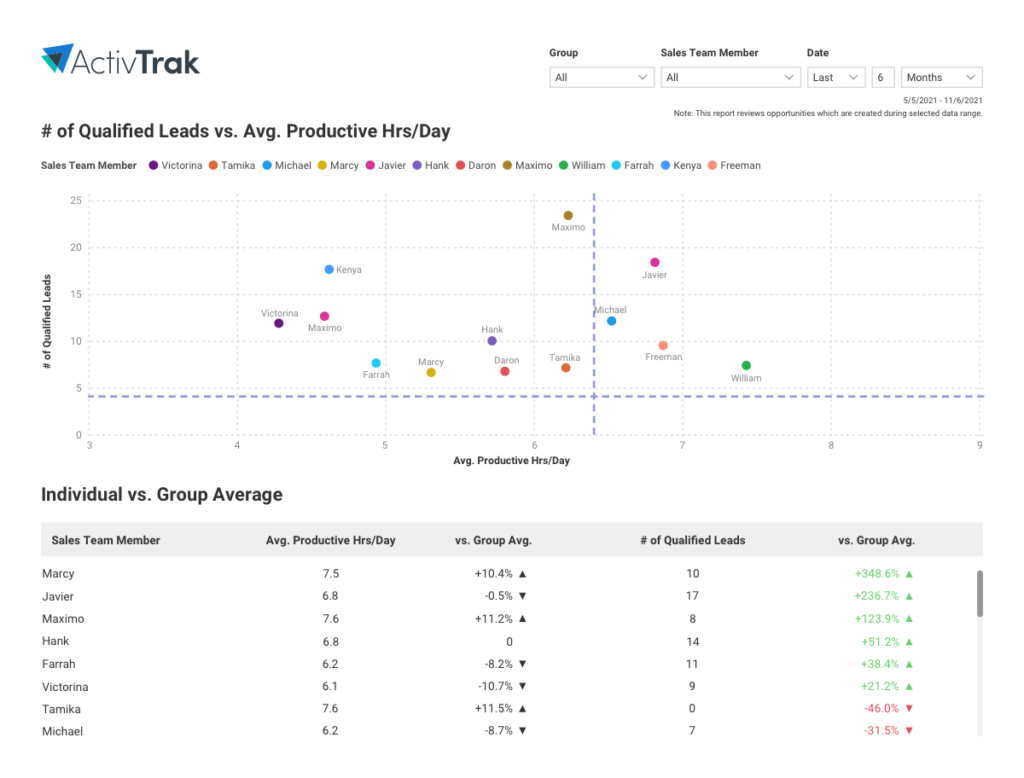 With this dashboard, you can compare the performance of sales team members by correlating the number of leads each sales rep qualifies per day versus the average productive hours per day.