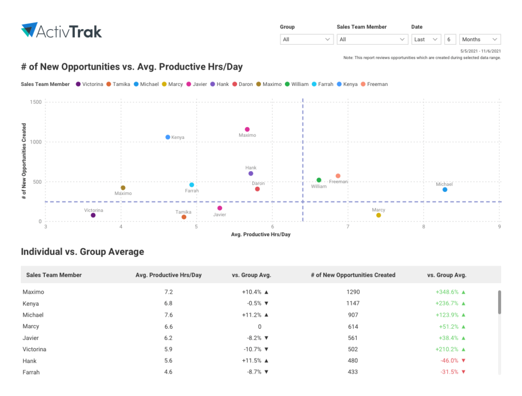 With this dashboard, you can compare the performance of sales team members by correlating the number of opportunities created by each sales rep per day versus the average productive hours per day.