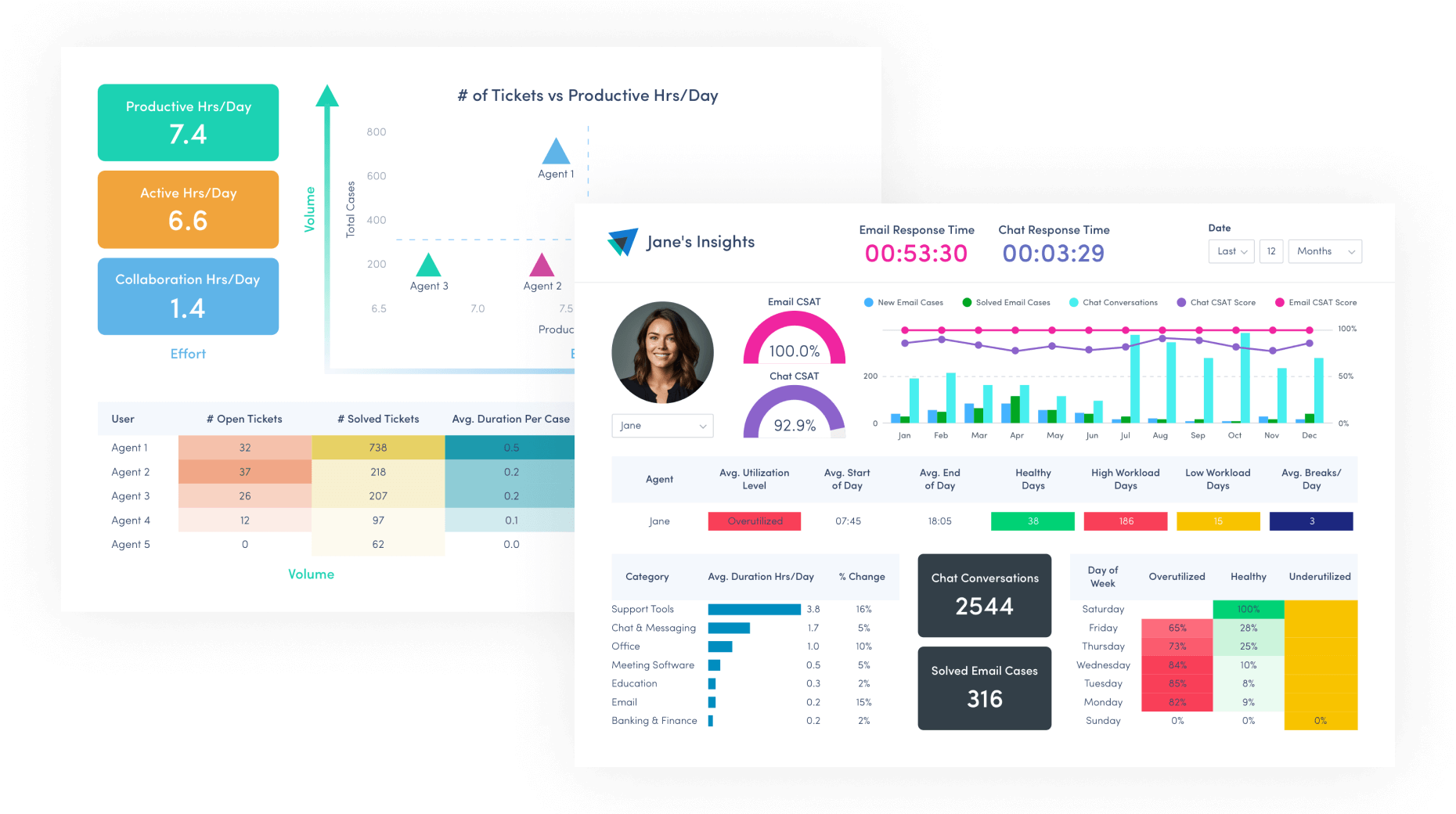 To balance increased productivity with employee well-being, the team needed to understand individual team member contributions and work habits at a glance. They also needed to be able to quickly identify coaching opportunities and recognize signs of burnout. The team wanted a single platform that could marry customer service data with productivity data and provide actionable insights to determine the best ways to get better as a team and drive results. At the same time, they needed to make sure they didn’t introduce the risk of attrition, burnout or poor support quality.