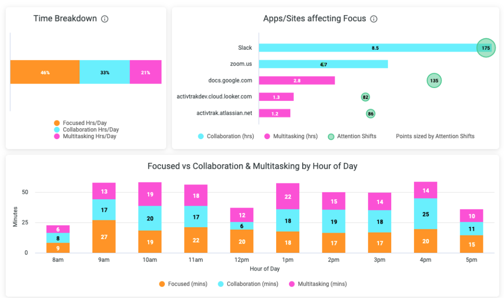 Time, by itself, is not a sufficient depiction of productivity. This is why the dashboard provides a breakdown of our daily productivity, efficiency, and focus data. While insight into productive time (the time spent on work-related apps and sites) is useful, the real value is in understanding how many hours it takes to complete our productive work — our productivity efficiency. For example, if our screen time is 12 hours/day and our productive time is 8, then we are far less efficient than if our screen time is 8.5 hours/day and our productive time is 8. This additional screen time could be valuable in terms of giving our minds a break from our work; however, it points to inefficiencies that could be otherwise draining us. (Moreover, breaks behind the screen seldom yield the intended outcome. You’re much better off going for a walk outside).