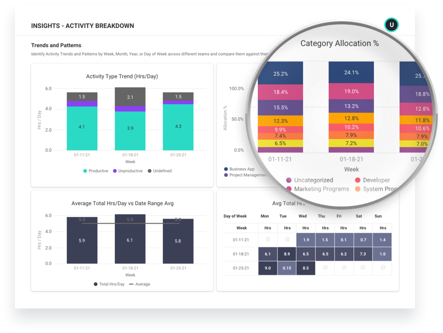 ActivTrak features unique pre-configured reports that highlight key takeaways and areas for improvement, and help managers better manage, coach and support their teams, including: