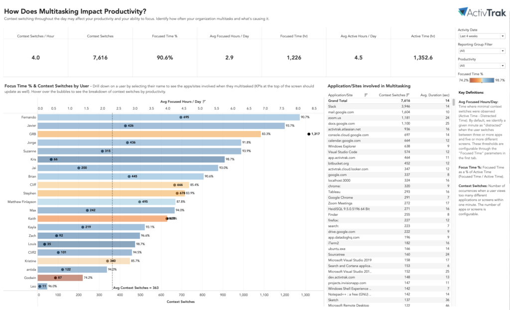 Already an ActivTrak customer? Easily integrate your ActivTrak data with your software stack for deeper analytics into how work gets done, including insights into context switching with premade report templates. Learn more.