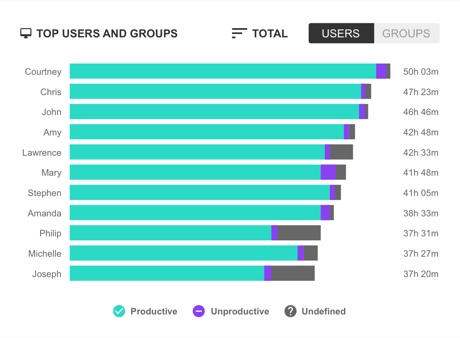 Workforce analytics can help predict burnout by highlighting the signs of burnout using data, benchmarks, and comparisons to peers. We aren’t talking about productivity or performance benchmarks this time, but rather aggregating data points such as total hours worked, time spent working outside of normal working hours including nights and weekends. Managers can also review a Break Time report to analyze trends of user activity related to taking breaks or lack thereof. Managers can also easily view patterns where there is or isn’t a healthy balance between work time and break/rest time across team members.
