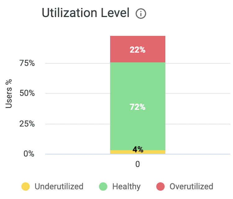 - Team Workload: While individuals across the organization may be battling burnout, the greatest risk exists when entire teams face these challenges at the same time. In these cases, leaders must pay immediate attention to where they can help alleviate the burden on a team at risk. With the introduction of “workload balance” metrics, leadership can view the composition of the employees on a particular team to better understand the extent in which the entire team is evenly sharing the productivity workload (versus a select few overutilized employees contributing to the healthy average of the team).