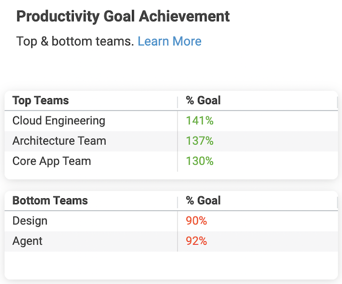 - Productivity Goal Achievement: The new Executive Summary Dashboard refocuses attention away from absolute productivity and toward goal achievement. In doing so, the emphasis is on sustainable achievement of daily goals versus the top teams merely working the most amount of hours– a metric that, when used improperly, can lead to burnout while stunting innovation and efficiency.