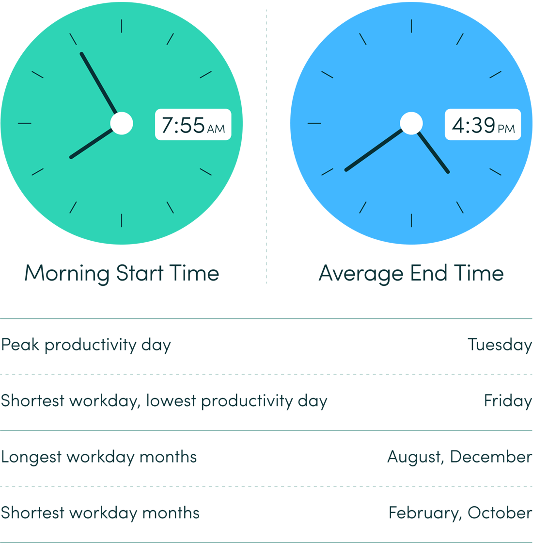 - The workday continues to evolve. Most notably, the workday is now 36 mins shorter (-7%) — averaging 8 hrs 44 mins a day. While employees consistently start their workday around 8 a.m., they finish earlier — shifting from 5:21 p.m. two years ago to 4:39 p.m. in 2024.