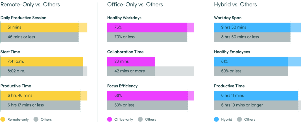 - Interesting paradoxes also emerge. Hybrid workers have the longest workdays (+1 hr vs. single-location workers) yet show lower productive time (-8 mins or more) and focused time (-12 mins). In contrast, remote-only workers excel in total productive time and session length, while office-only workers have higher focus efficiency and healthier work patterns.
