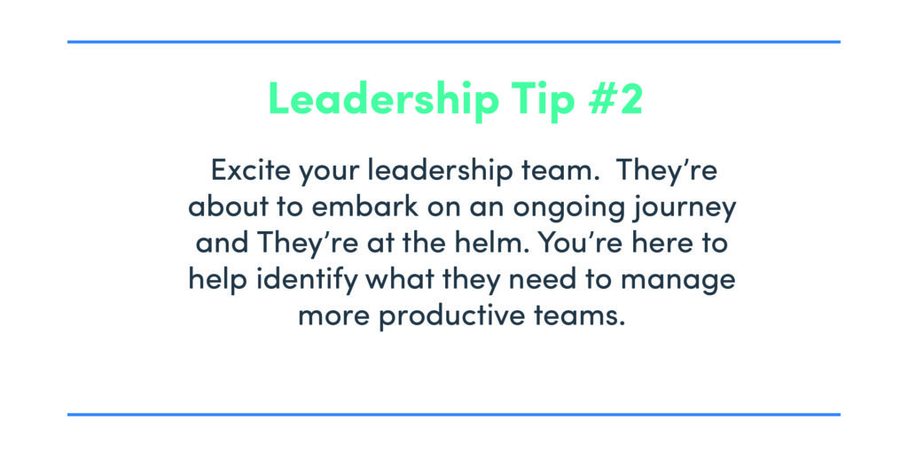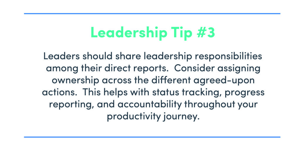 Brainstorming and choosing the right actions and responses to improve an organization’s productivity begins with leadership alignment. Leveraging data insights that uncover productivity barriers and opportunities for improvement provides factual evidence from which the group can align. The data reveals to leadership not only that the gaps exist, but also their level of magnitude and organizational pervasiveness. Establishing leadership alignment on productivity barriers and necessary support allows the team to quickly move into response prioritization.
