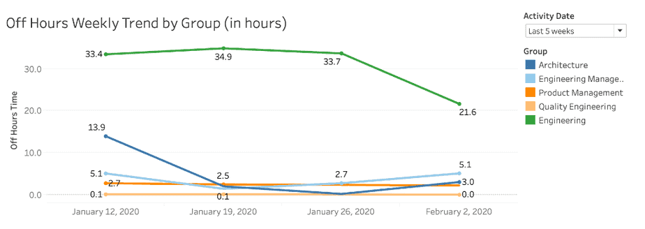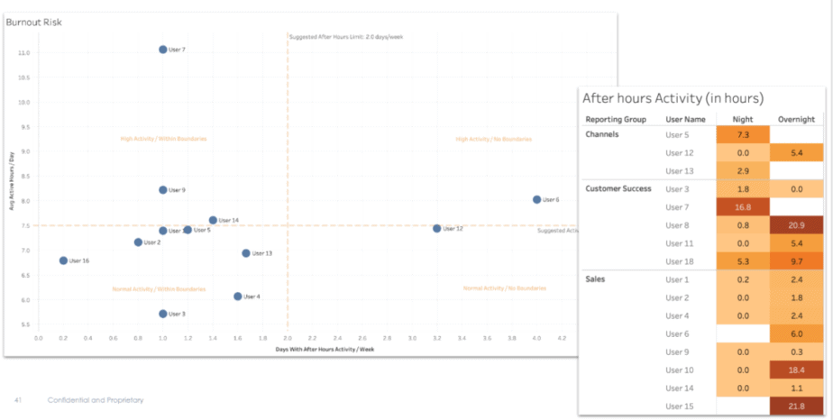 Measure activity performed after-hours (between 6pm and 6am local time) and during weekends to identify employees who may be working too many hours. This can help identify those who are at risk for burnout or can help managers become aware of possible unbalanced workloads across the teams and make adjustments. View productivity by weekly trends, in aggregate across teams, or in a heatmap grid for quick comparison of each individual team member.