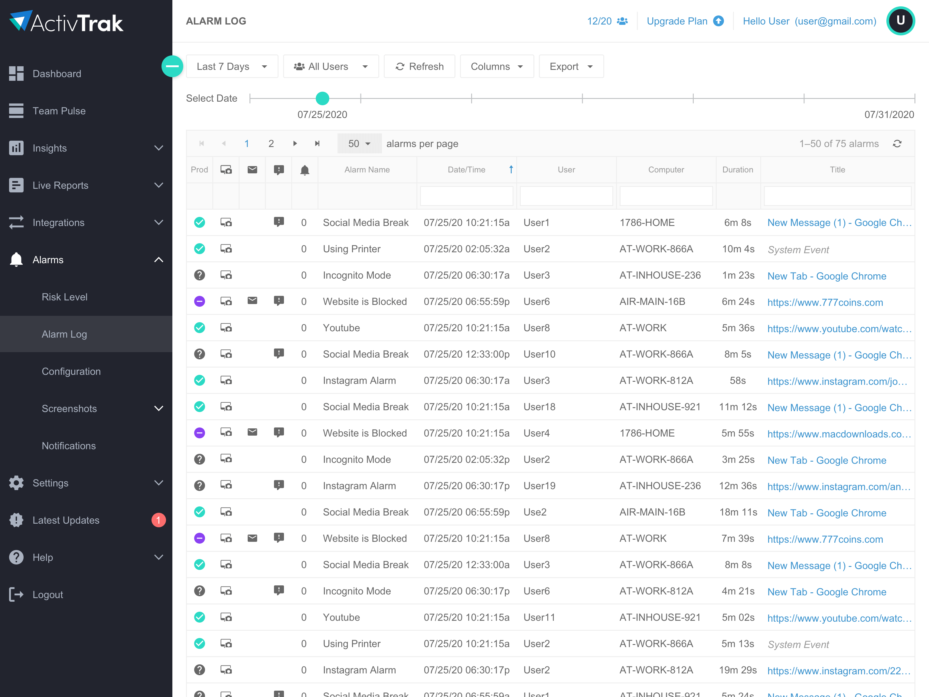 Utilize pre-built alarms and custom create your own with any combination of conditions to fit your operational compliance needs. With Activity alarms you can: