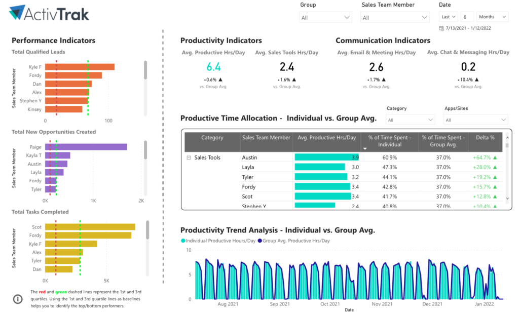 ActivTrak’s Salesforce integration is available for paid plans with the ActivConnect add-on and an activated Microsoft Power BI Pro license for content publishers and viewers. Using combined, deep sales productivity insights, sales managers can easily coach and empower sales reps to focus on what matters most – getting results.