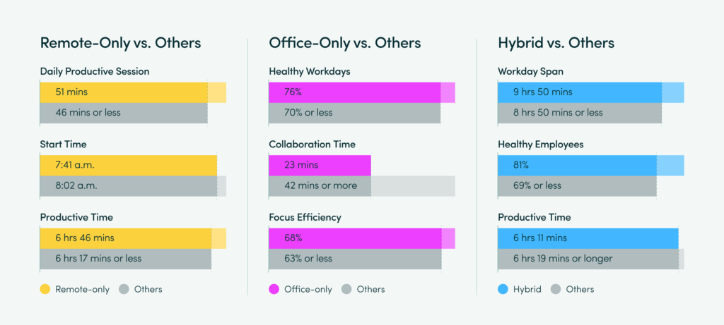After examining five unique work location types — remote-only, remote-first, hybrid, office-first and office-only — several productivity patterns emerged, including that the majority of employees (53%) spend more than 60% of the year working in a remote environment.
