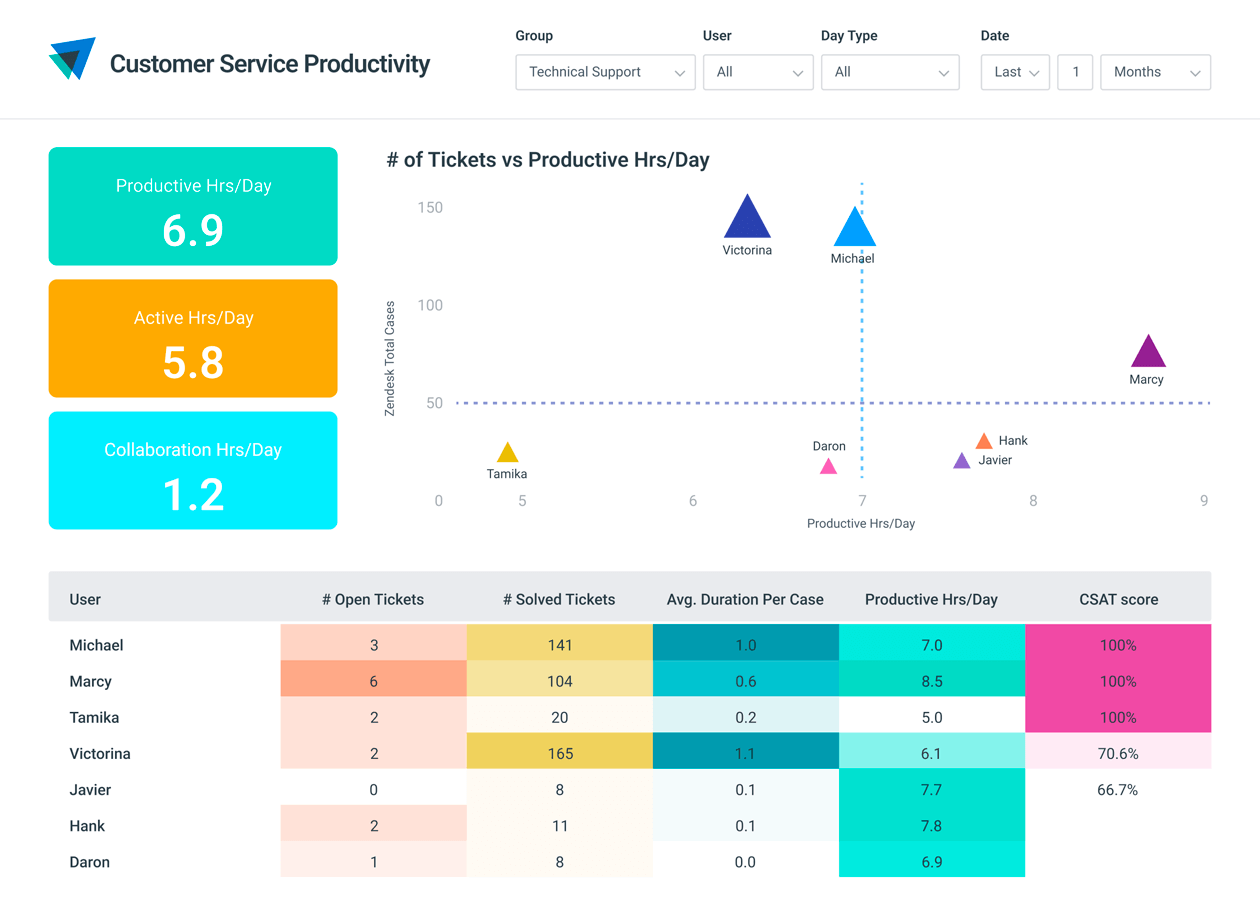 Initiatives to build and continuously improve employee engagement starts with understanding how your organization is doing. Administering an employee engagement survey provides a moment-in-time snapshot, however, pairing that with actual workplace data collected on an ongoing basis, can give you a true picture of employee engagement. Leverage these insights – technology usage, activity breakdown, focus, sources of inefficiencies – as a coaching tool to help increase employee engagement and job satisfaction.