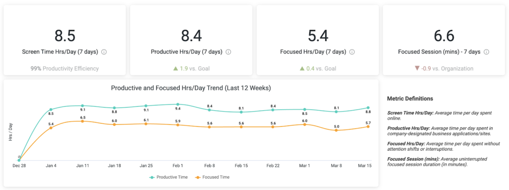 Time, by itself, is not a sufficient depiction of productivity. This is why the dashboard provides a breakdown of our daily productivity, efficiency, and focus data. While insight into productive time (the time spent on work-related apps and sites) is useful, the real value is in understanding how many hours it takes to complete our productive work — our productivity efficiency. For example, if our screen time is 12 hours/day and our productive time is 8, then we are far less efficient than if our screen time is 8.5 hours/day and our productive time is 8. This additional screen time could be valuable in terms of giving our minds a break from our work; however, it points to inefficiencies that could be otherwise draining us. (Moreover, breaks behind the screen seldom yield the intended outcome. You’re much better off going for a walk outside).