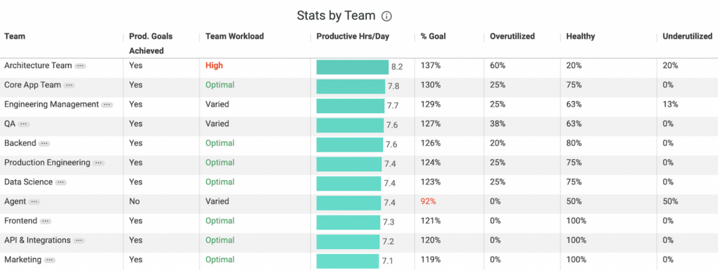 - Productivity Goal Achievement: The new Executive Summary Dashboard refocuses attention away from absolute productivity and toward goal achievement. In doing so, the emphasis is on sustainable achievement of daily goals versus the top teams merely working the most amount of hours– a metric that, when used improperly, can lead to burnout while stunting innovation and efficiency.