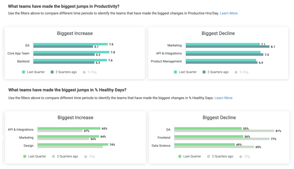 - Behavioral Shifts: The new report highlights major climbs and dips in team productivity behaviors. In doing so, it becomes substantially easier for leaders to see where they can outwardly appreciate and celebrate team improvement across the organization. This also reveals where support and intervention may be critical. In surfacing substantial changes in team behavior, leaders gain greater visibility into where they can provide timely, tailored, and relevant support.