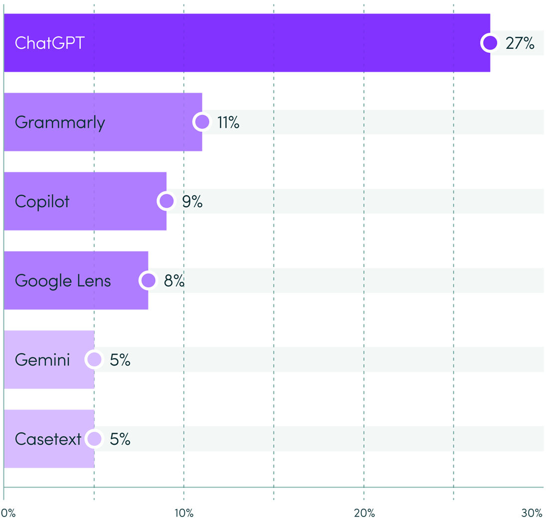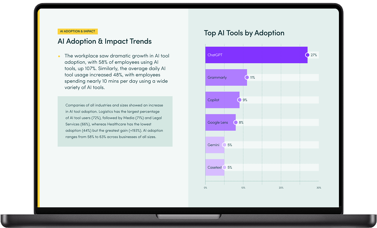 - The workplace saw dramatic growth in AI tool adoption, with 58% of employees using AI tools, up 107%. Similarly, the average daily AI tool usage increased 48%, with employees spending nearly 10 mins per day using a wide variety of AI tools.