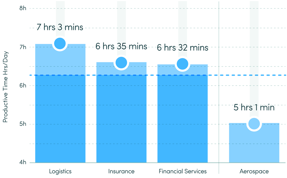 By industry, Logistics leads the way with 7 hrs 3 mins of productive time, followed by Insurance (6 hrs 35 mins) and Financial Services (6 hrs 32 mins). The Aerospace industry has the least productive time at 5 hrs 1 min.