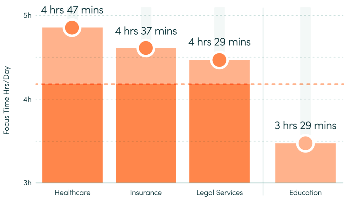 Industry analysis shows Healthcare leading in daily focused hours at 4 hrs 47 mins (+36 mins above average), with Insurance and Legal Services also showing strong focus time. Education has the lowest focus time at 3 hrs 29 mins.
