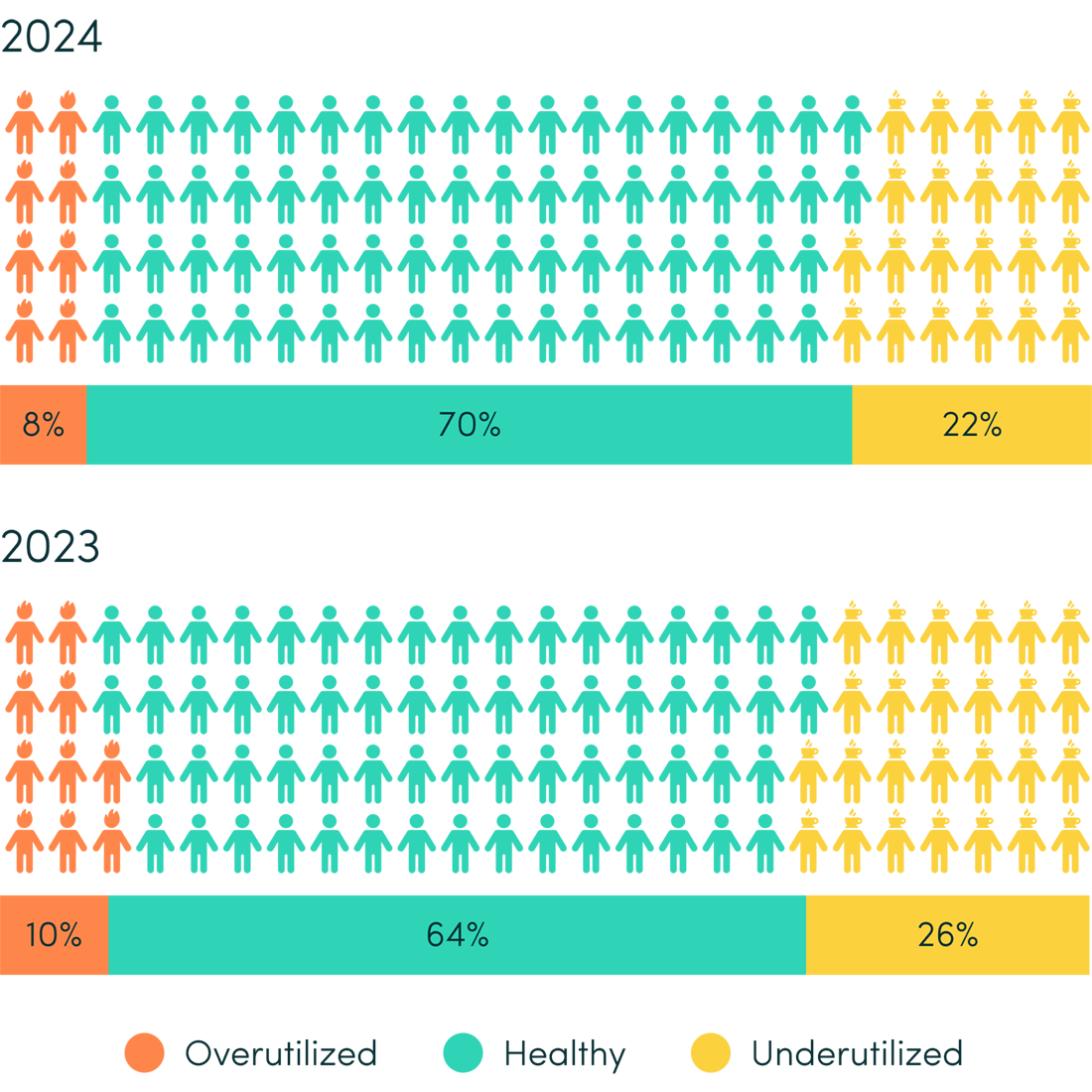 - Compared to 2023, this includes a 21% drop in overutilized employees, and a 14% drop in underutilized employees.