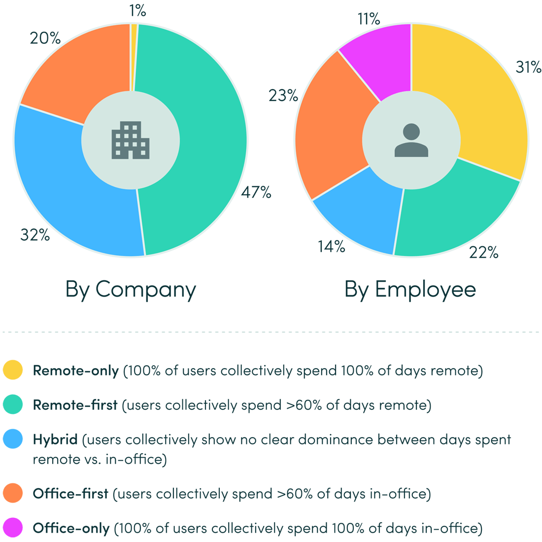 - After examining five unique work location types — remote-only, remote-first, hybrid, office-first and office-only — several productivity patterns emerged, including that the majority of employees (53%) spend more than 60% of the year working in a remote environment.
