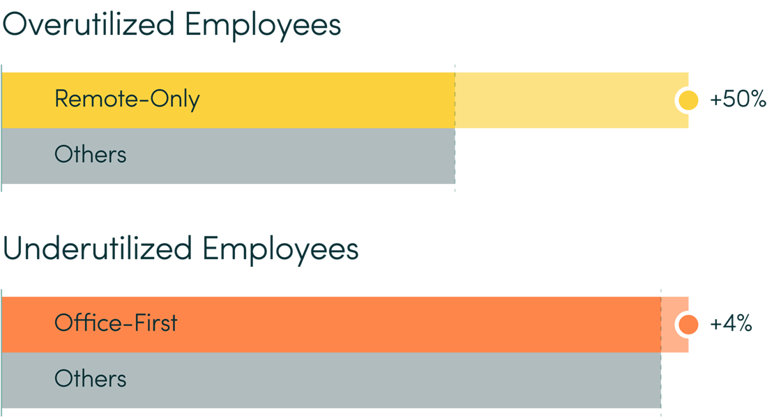 - While all location types have similar percentages of healthy employees, remote-first companies have the highest percentage of overutilized employees (1.5X more vs. other location types). In contrast, office-first companies have a greater percentage of underutilized employees (+4% or more). [Data Set C]