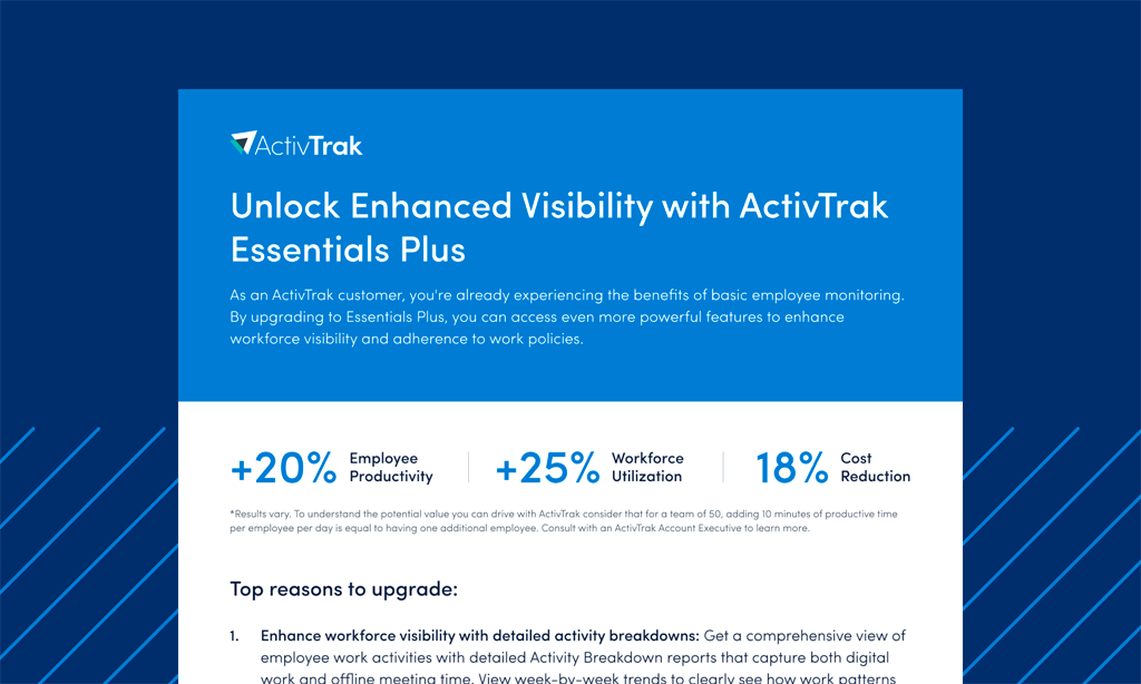 Unlock enhanced visibility with ActivTrak Essentials Plus. Download the data sheet and get started for free.
