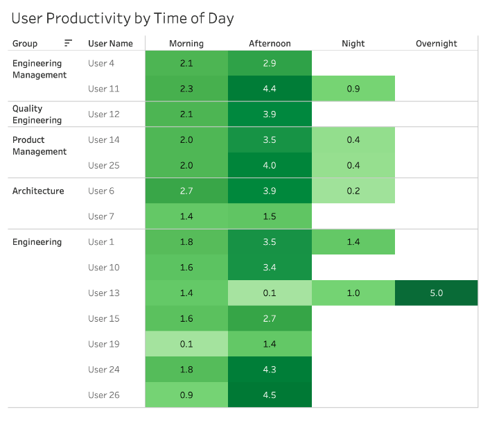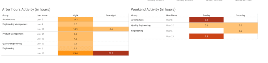 Measure activity performed after-hours (between 6pm and 6am local time) and during weekends to identify employees who may be working too many hours. This can help identify those who are at risk for burnout or can help managers become aware of possible unbalanced workloads across the teams and make adjustments. View productivity by weekly trends, in aggregate across teams, or in a heatmap grid for quick comparison of each individual team member.
