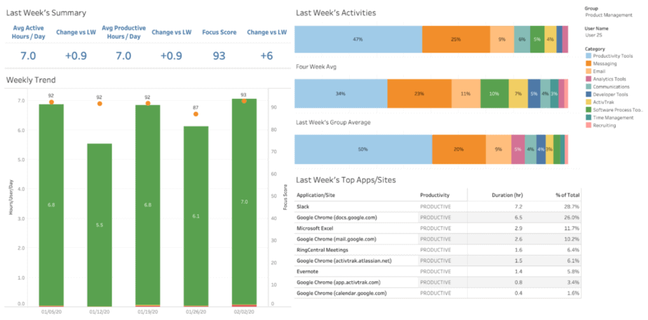 View a personal weekly summary by each individual to compare trends across time horizons and activities. Managers and individuals can understand key activity and productivity metrics including which apps or tools are being used and whether that translates to productivity. Measure progress with quantitative data over time or against team averages. Use the data insights as coaching opportunities to celebrate achievements or discuss areas for improvement.