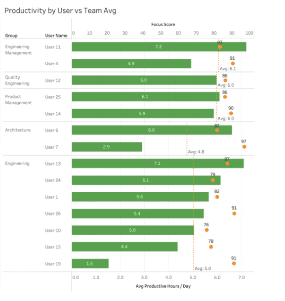 Focus Scores can also be used to determine benchmarks of team productivity. Learn where work time is spent, uncover gaps in productivity focus areas and view comparisons by individuals and groups or teams. Analyze productivity & focus metrics for different users and benchmark the team averages.