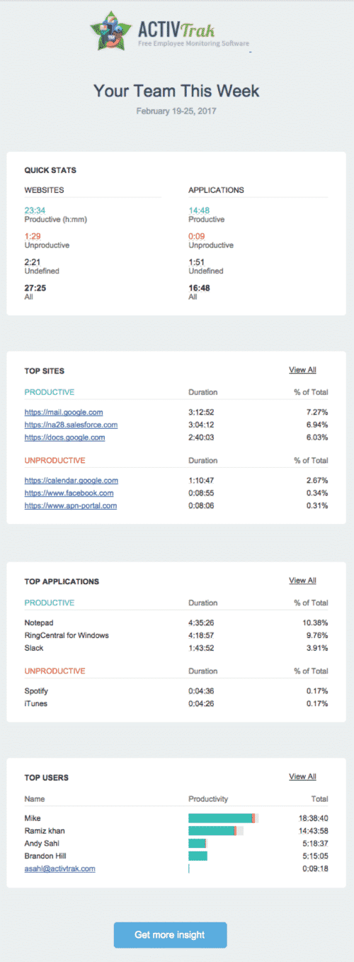 Once a week, you’ll receive a handy little email that provides you with some high-level stats from your ActivTrak account. We think this will make managing your account much easier to quickly identify issues and outliers that require your attention.