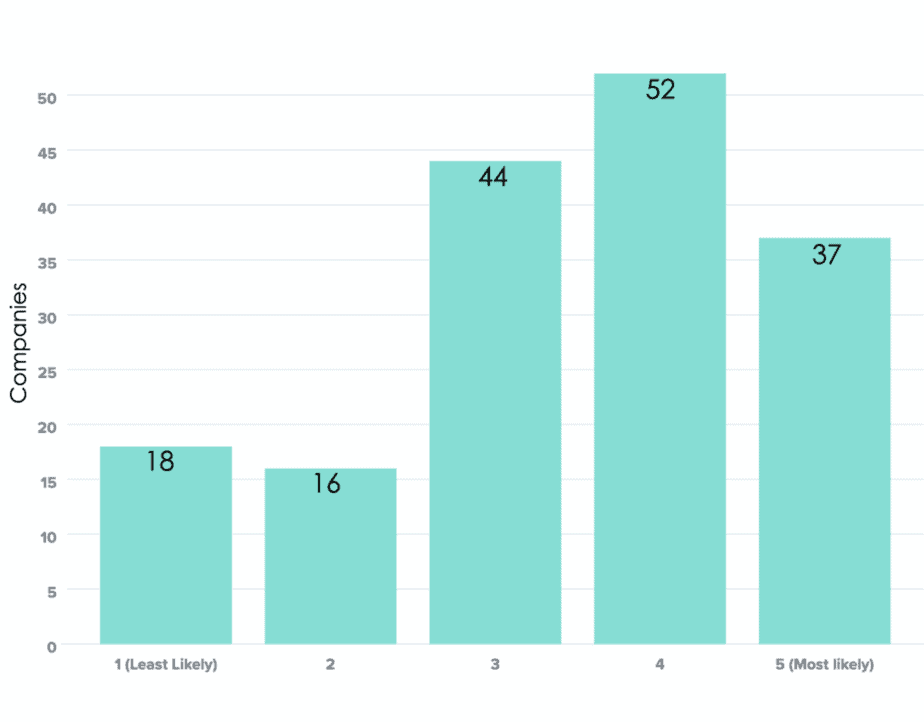 Q14: Based on the current success of your remote workforce, how likely are you to re-evaluate your company’s remote workforce expectations for employees following the pandemic? (1 = least likely, 5 = most likely)