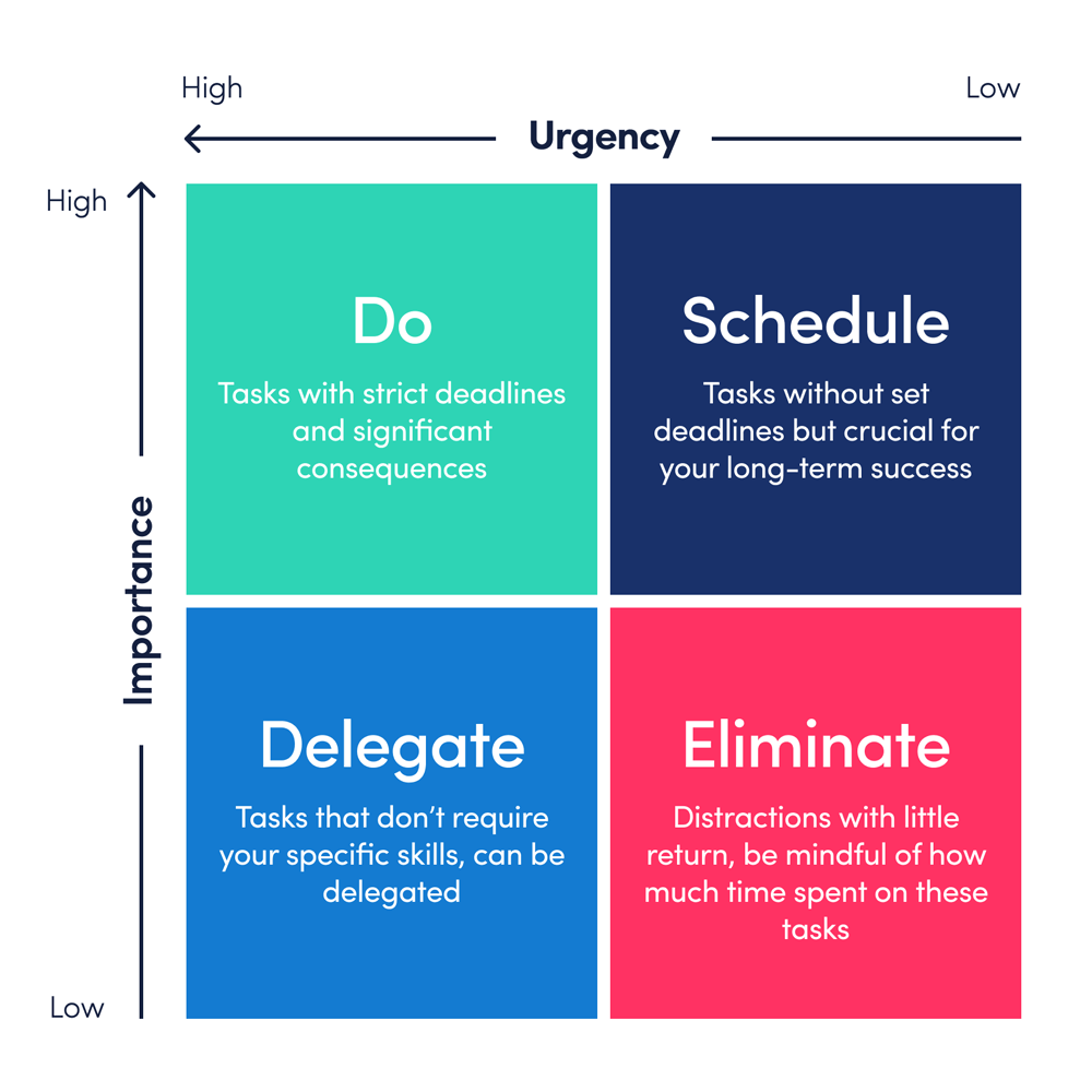 Applying the Eisenhower Matrix allows you to bring clarity to a long list of responsibilities. To use it, divide assignments into four quadrants: