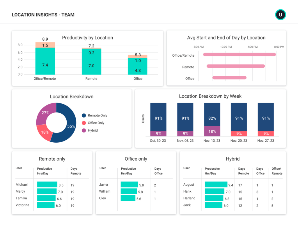 View productivity by location to compare remote, in-office and hybrid work activity and see where team members are most efficient.