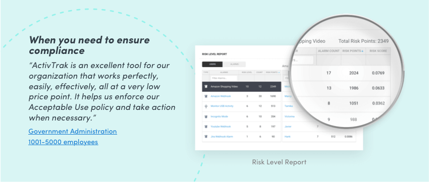 - Benefit: Easily identify and monitor risky behavior within your organization to help ensure company policies are adhered to.